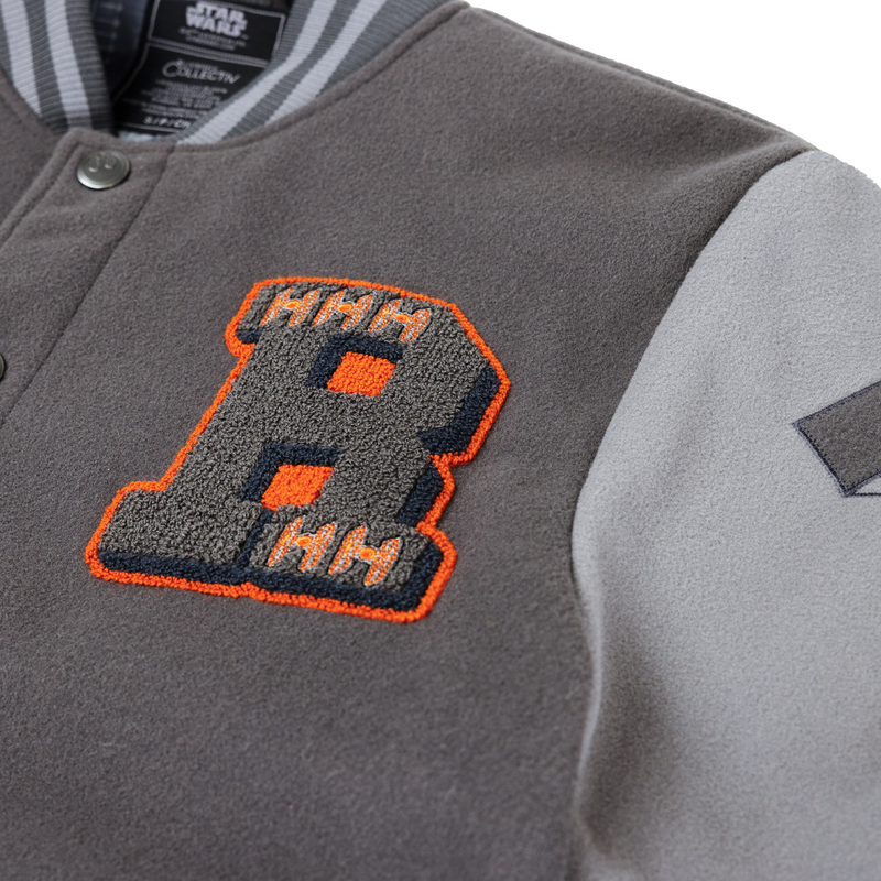 Show your allegiance in stealth style with our Loungefly COLLECTIV STAR WARS™ Rebel Alliance™ VRSITY Jacket. This fashionable jacket features discreet callouts to your favorite fandom. Elevated details, such as embroidery and chenille patches, add varied textures and an elegant flair. At the top, there’s a chenille patch “R” with orange Rebel X-Wings™. Another patch at the top features the Rebel Alliance helmet, with “Red-Five” embroidered below. The sleeves are color-blocked, with chenille patches displaying the embroidered Rebel Alliance logo in orange, along with Rebel X-Wings. Custom-molded metal snaps, down the front, feature the Rebel Alliance symbol as well. Screen printing, at the pocket openings, adds a touch of color in a motif consisting of the STAR WARS logo and Rebel Alliance symbol. On the back, the embroidery in orange says “Rebel” in Aurebesh, and embossed art of the Rebel Alliance symbol makes a grand encore appearance.