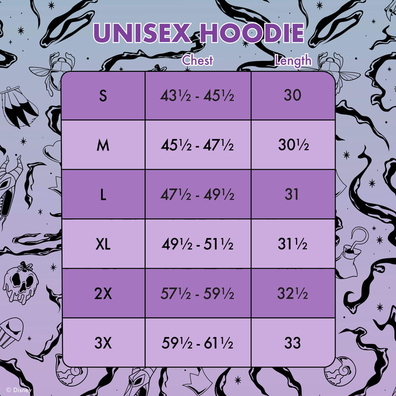 Gleam while you scheme! Wreak fashionable havoc with our Disney Villain’s hoodie. This cozy color-block hoodie features several famous Disney Villains. The front, in black, reveals the silhouttes of the Evil Queen, Maleficent, Ursula, and Jafar in elegant lines and color accents. A shock of blue makes the Evil Queen’s crown stand out. Iridescent foil, for a few select details, adds extra shine. The sleeves, in purple or pinkish red, feature symbols characteristic of several different Disney Villains. Stay wickedly warm on whatever adventures your dark heart desires.