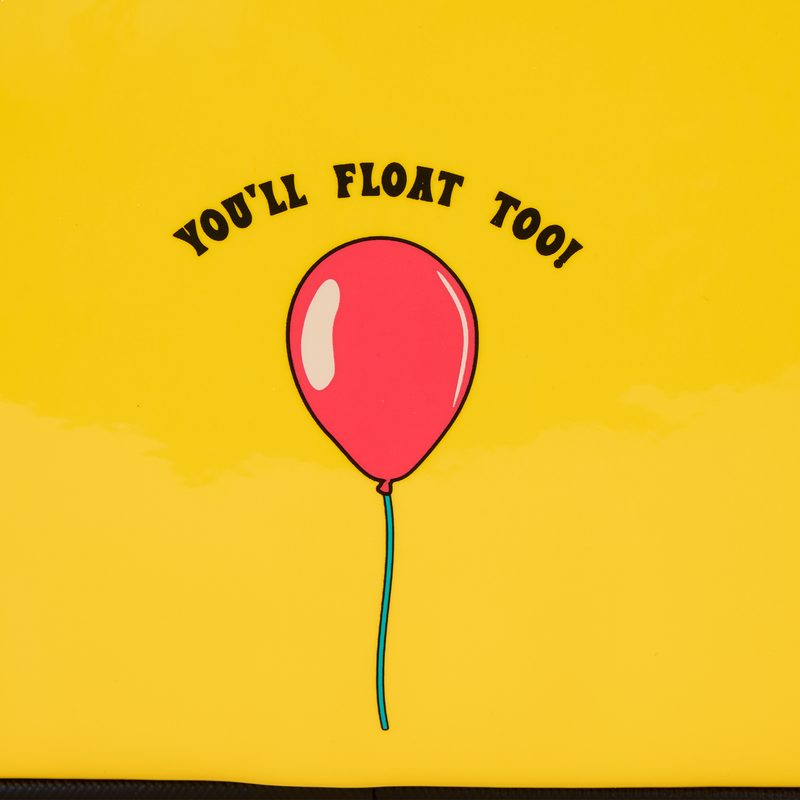 Explore creepy tunnels in style—and in wickedly fun company. Bring along this mini backpack featuring Pennywise from IT. A faux patent leather material in yellow adds a rain-slicker shine to this accessory. The front pocket has real buttons and cords for a cosplay effect. Above the front pocket, Pennywise’s face appears—and it glows in the dark. You might also be able to spot an applique of Georgie’s paper boat. Flip the backpack around, and you’ll find the words “You’ll Float Too.” Sail through your day with a monstrously stylish accessory.