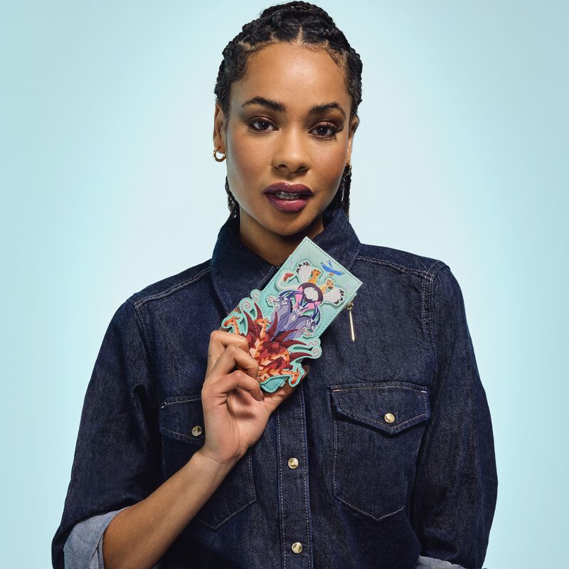 Wallet zips closed and snaps shut. Other features include shiny silver hardware, three slots for holding cards, a clear window slot for holding your ID, vegan leather (polyurethane), and printed details. Note the coordinating lining.