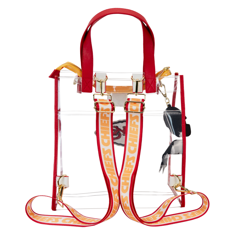 Feeling game-day ready? Cheer on your favorite football team with this convertible tote bag! The clear design makes it easy to bring your belongings into the stadium, and versatile shoulder straps help to keep your bag close as you wander the crowds. A chenille patch of the Chiefs logo, a helmet-shaped bag charm, and coordinating team colors give this bag an elevated look. No need to sacrifice your style at the big game – this accessory is the perfect combination of fashion and function.