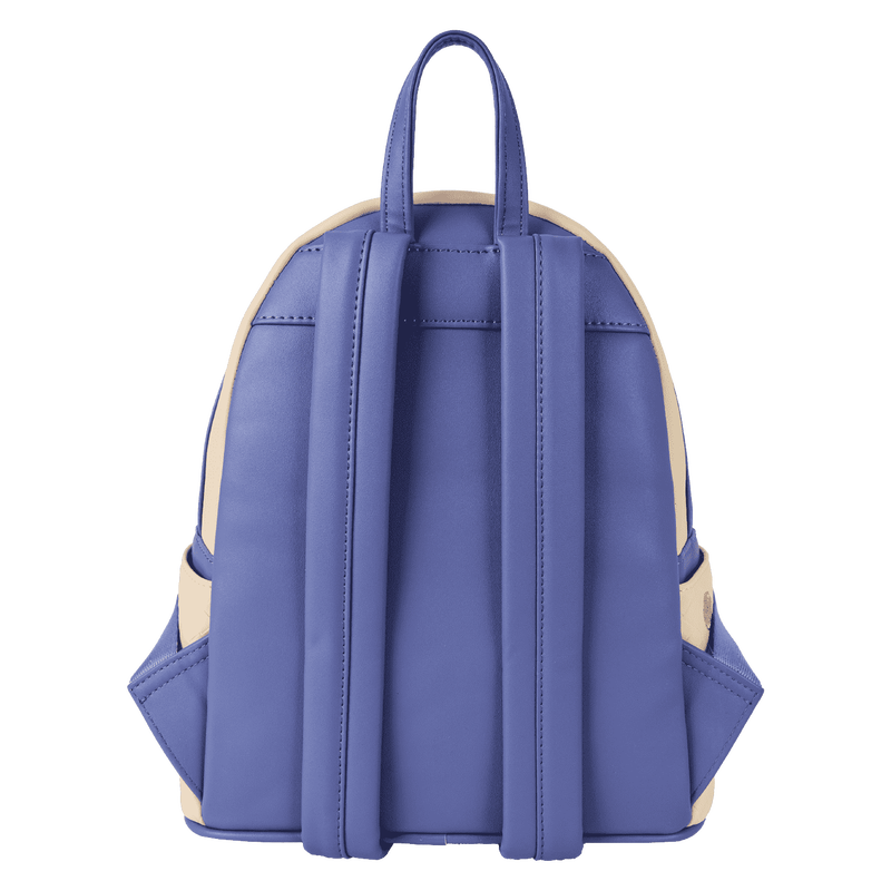 Gorgeous pink roses are embroidered around an image of Prince Phillip and Princess Aurora from Disney’s Sleeping Beauty. More floral details appear on the side pockets over a woven faux leather background for a more dynamic design.