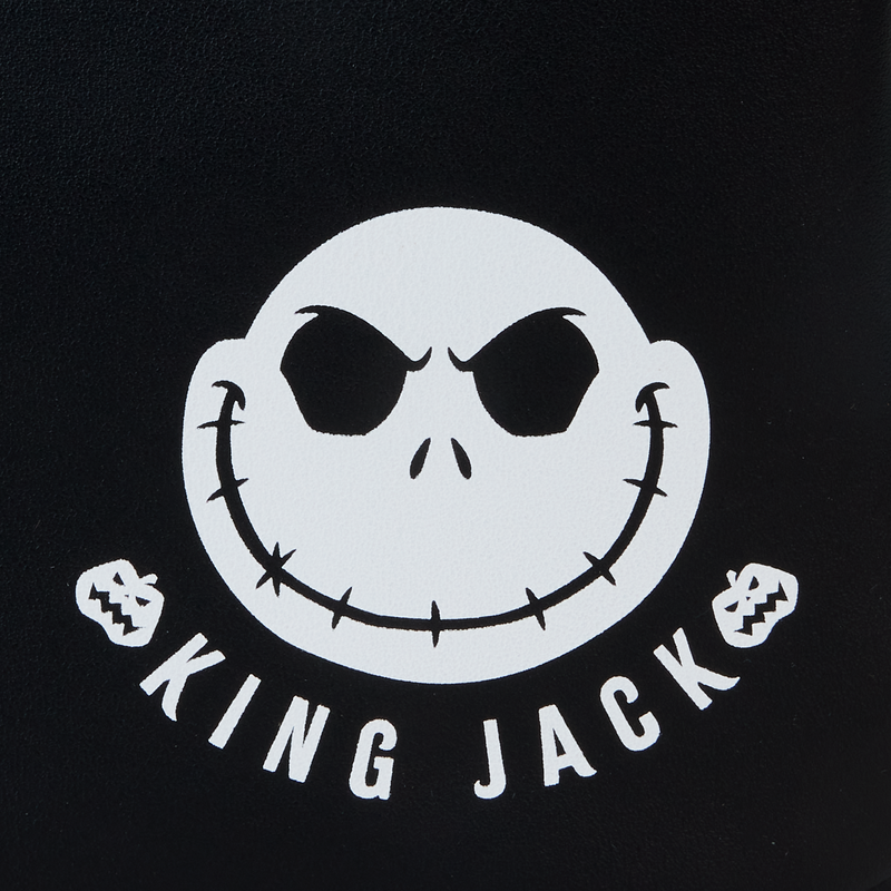 Sparkle, shine, and cause a scream! Take along our exclusive Disney Tim Burton’s The Nightmare Before Christmas Jack Skellington Sequined Mini Backpack. This accessory features Disney’s Jack Skellington in applique, sequined, and embroidered details. Sparkly white sequins cover the top and Jack’s “face” on the dome-shaped part of the backpack. The front pocket also features white sequins for the shirt of his costume, and his signature black-and-white pin-striped suit takes shape in splendid form. His applique hands cross over the front zipped compartment. On the back, Jack appears again as a print with the words “King Jack” below him. Look hauntingly stylish wherever you go!